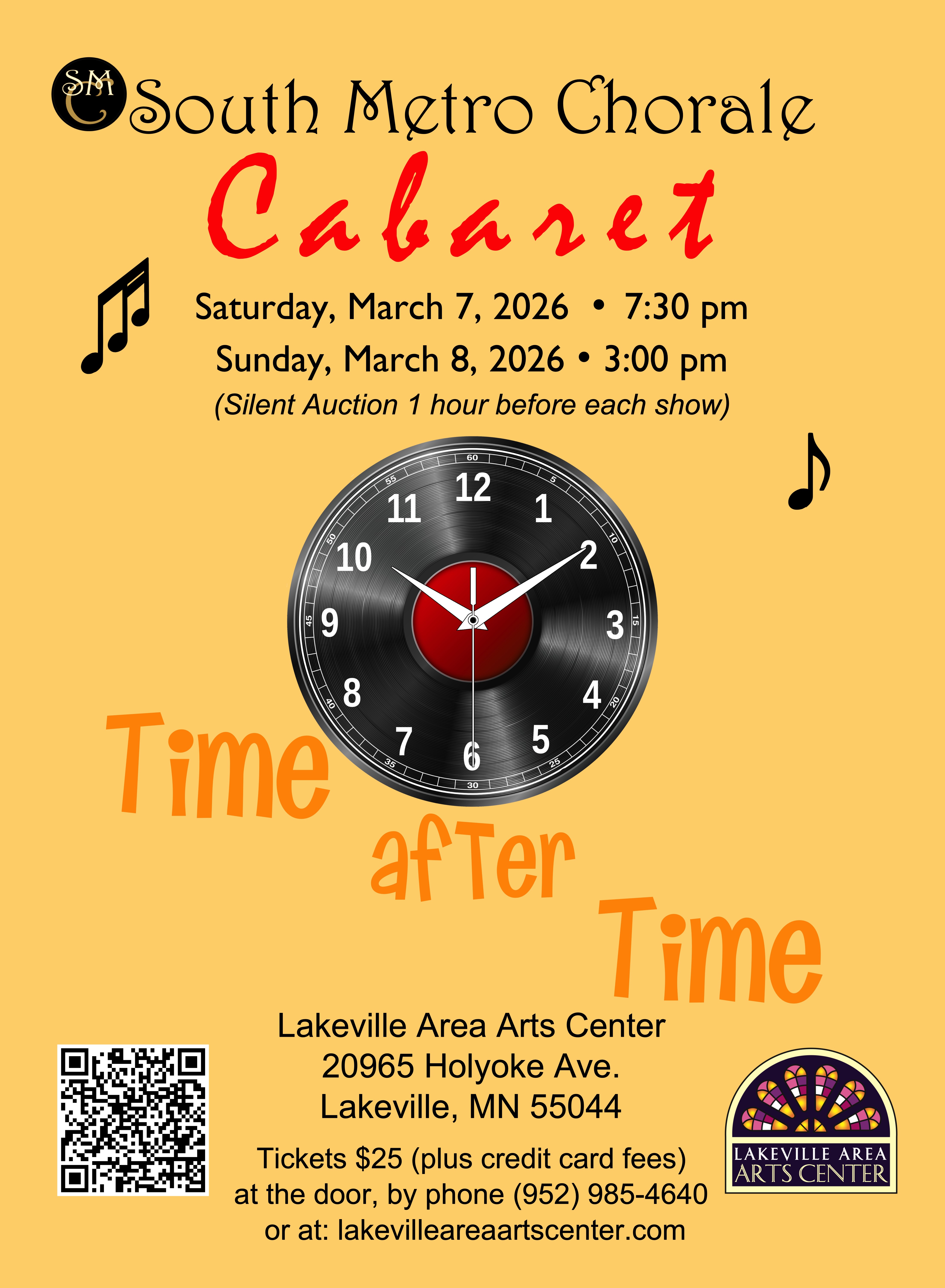 South Metro Chorale presents its annual cabaret performance featuring songs about time. Let us take you on a journey through musical styles and decades featuring some of the greatest songs ever written! You will also have the chance to win some great prizes at our silent auction and 50/50 raffle. It’s sure to be a good TIME!